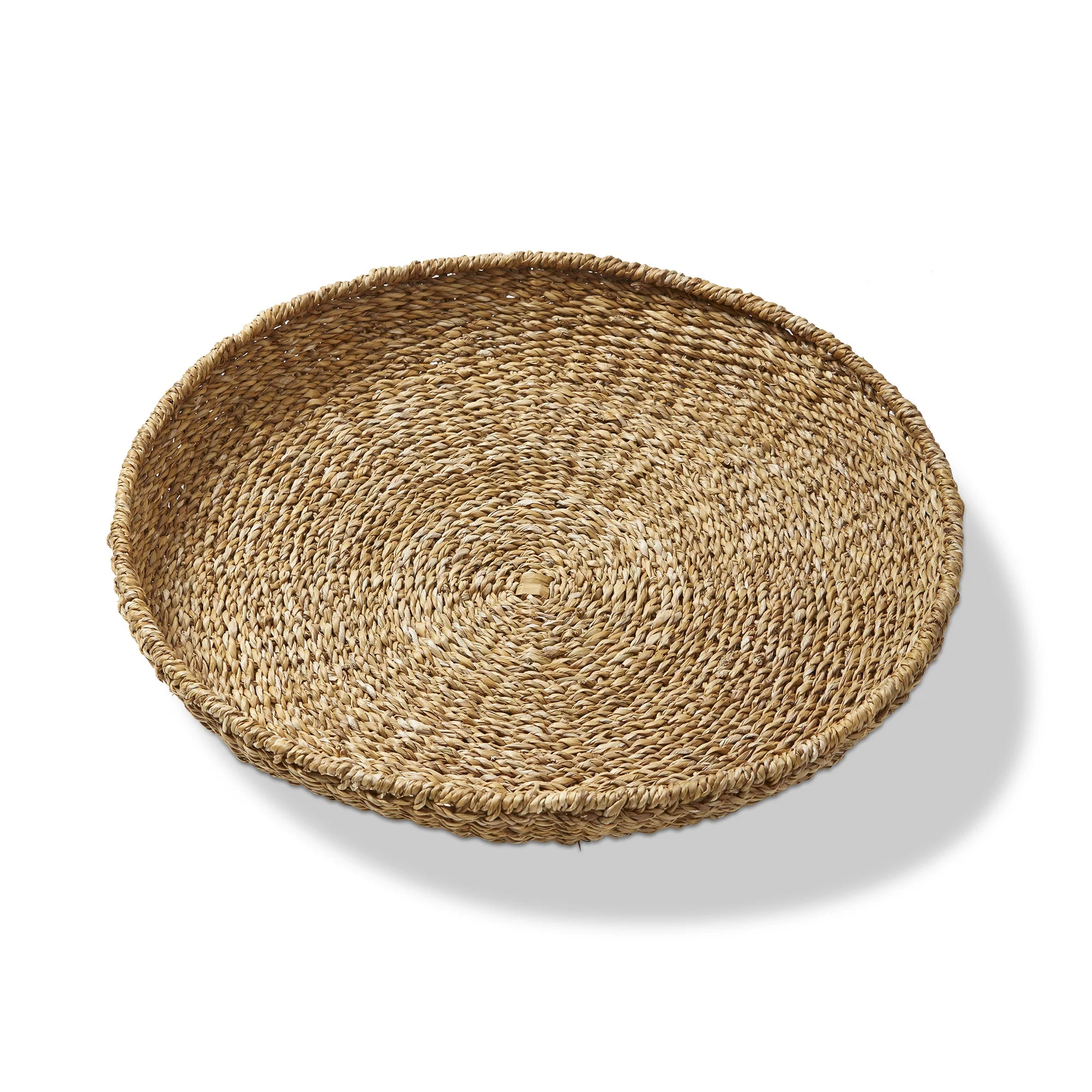 This natural decorative seagrass round tray with iron handles is a beautiful and versatile piece that can be used for a variety of purposes. it is made from seagrass, a sustainable and renewable material, and features two sturdy iron handles for easy carrying. this tray is perfect for serving food and drinks, displaying decorative items, or organizing small items. it can be used as a coffee table tray, ottoman tray, or serving tray in any room of your home.