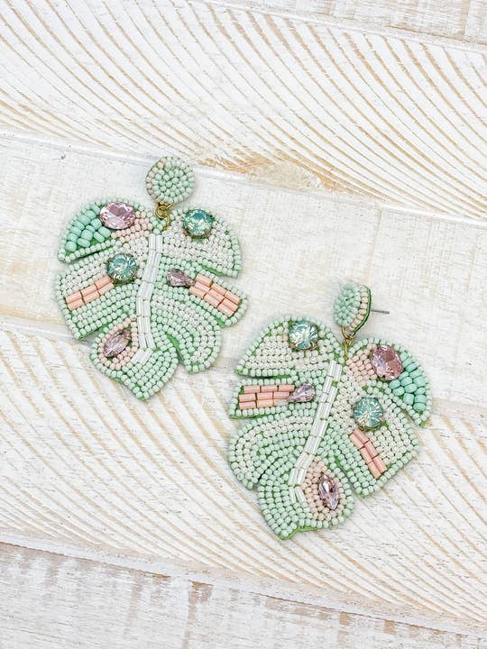 Seed Bead & Jewel Palm Leaf Dangle Earrings - Mint