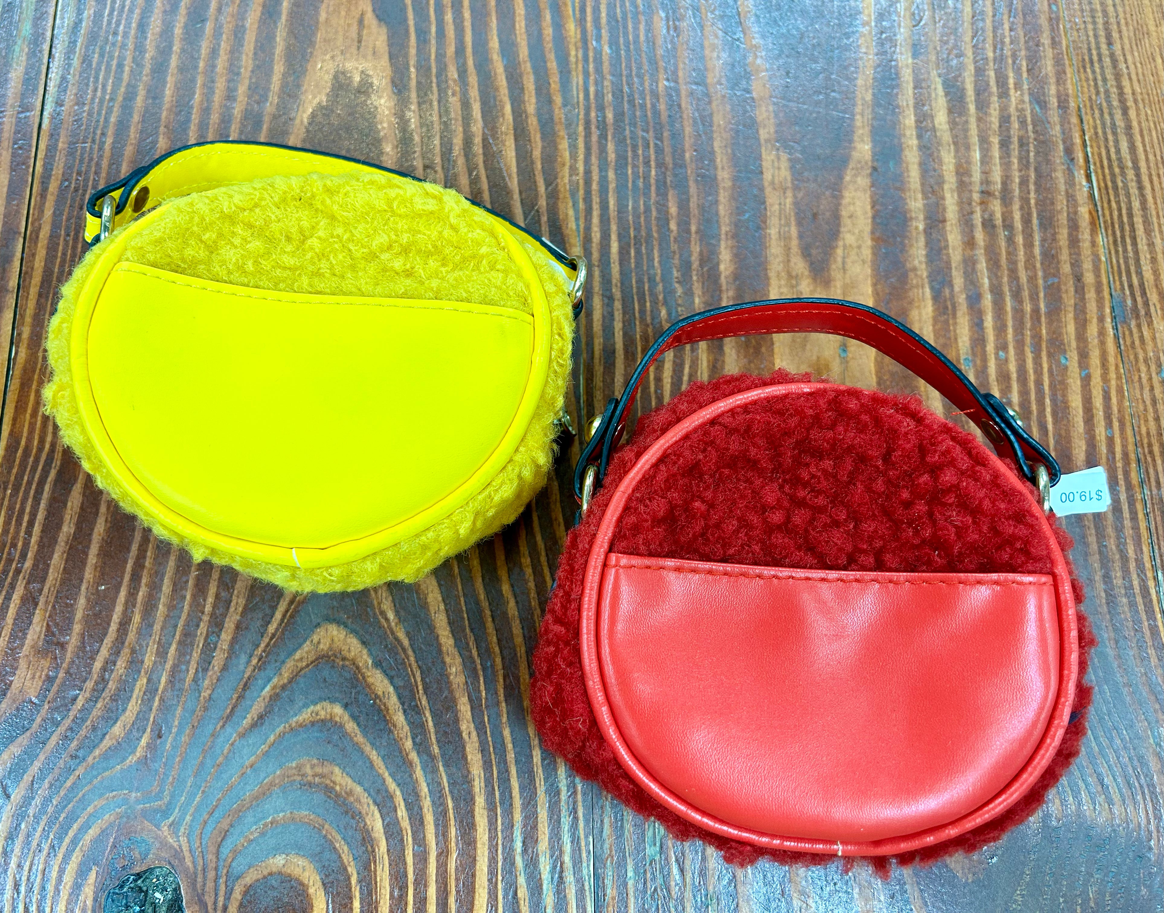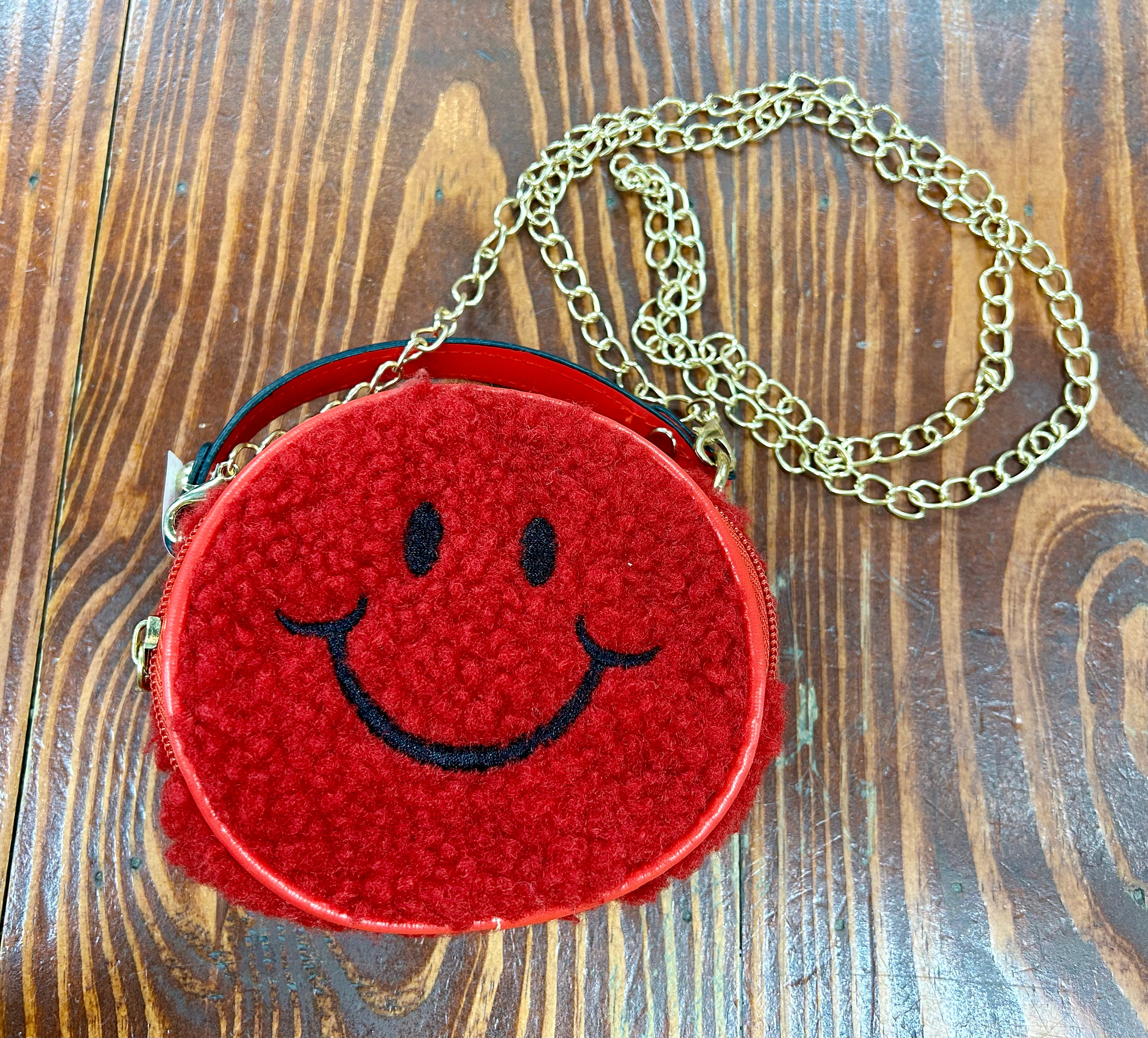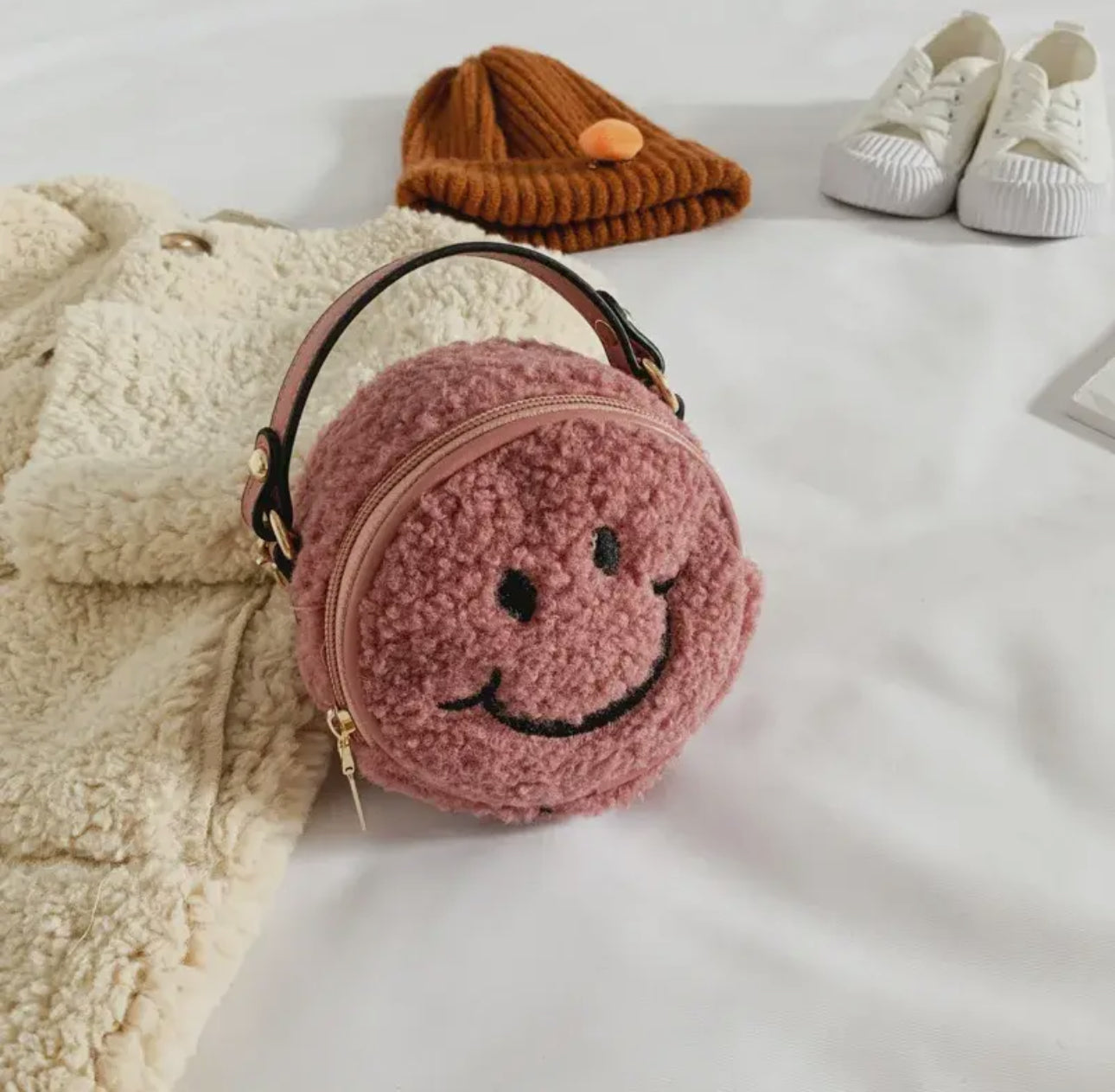 Adorable plush round smiley face purse for kids! Gold chain for crossbody and assorted colors for purse.