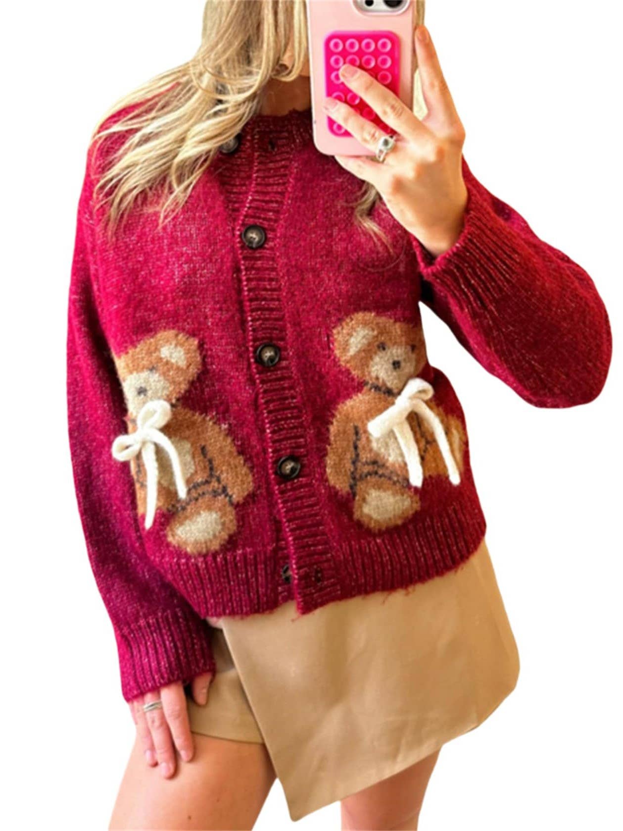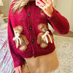 Snuggle up in adorable style with this teddy bear patterned cardigan! Featuring a cozy knit construction and convenient button-front closure, it's the perfect layering piece for adding warmth and whimsy to any outfit. The charming bear design brings a touch of fun to your wardrobe, while the classic cardigan silhouette keeps things versatile. Whether you're pairing it with jeans for casual comfort or dressing it up for a night out, this sweet sweater delivers both cuddles and chic appeal. Note: Sizing runs differently than standard—be sure to review our size chart before ordering!