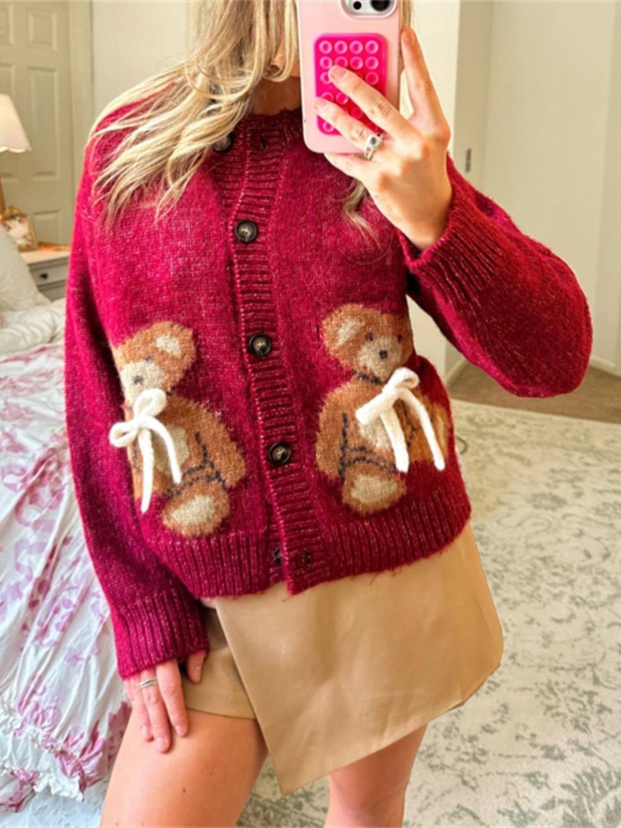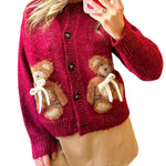 Teddy Bear Patterned Buttoned Knit Sweater Cardigan