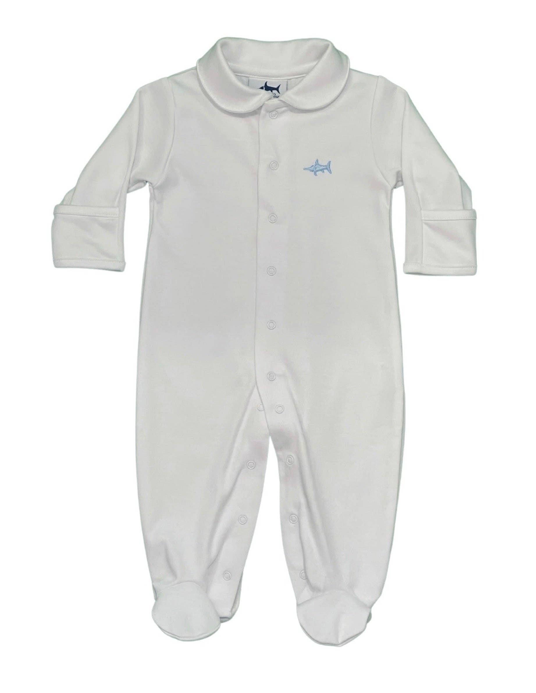 The Welles Romper features convenient snap closures down the bodice and legs and a classic peter pan collar neckline. This versatile romper is completed with a light blue Saltwater Boys Company embroidered signature marlin on the left chest.