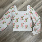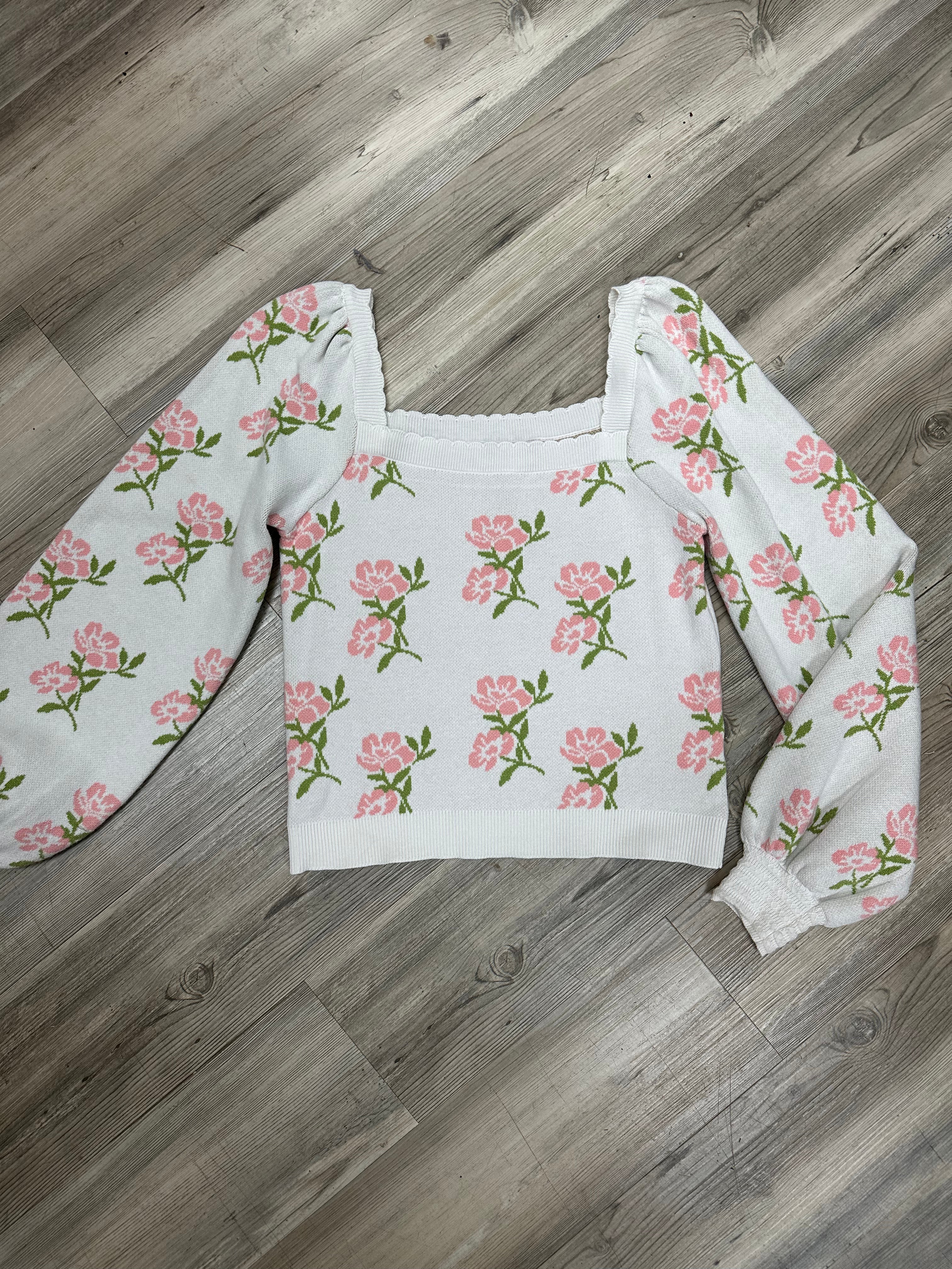 This charming sweater features a delightful pink floral design paired with a trendy square neckline finished with a sweet scalloped edge. Perfect for adding a touch of whimsy to your everyday wardrobe, it's a playful piece that brings both comfort and style to any outfit.