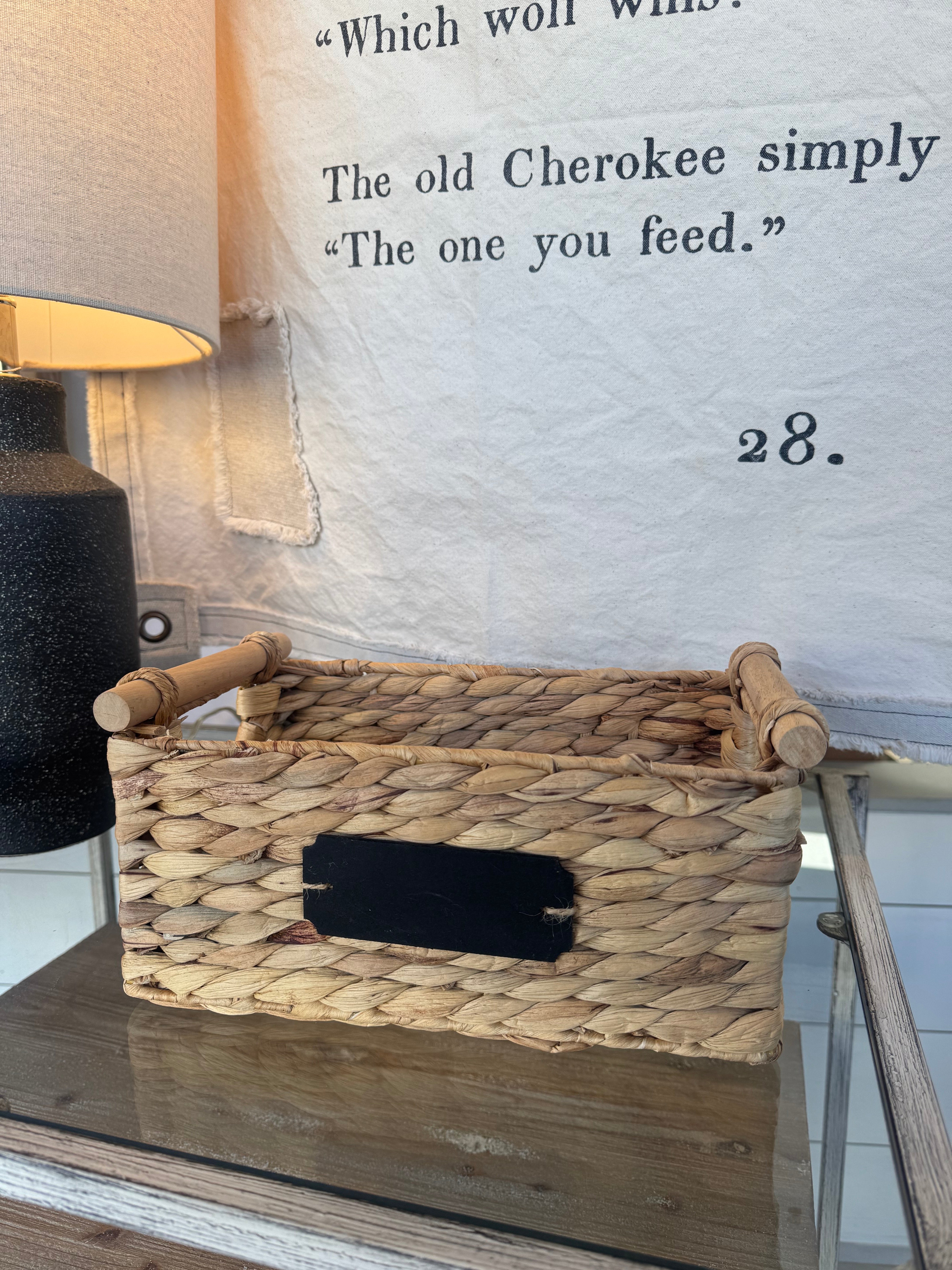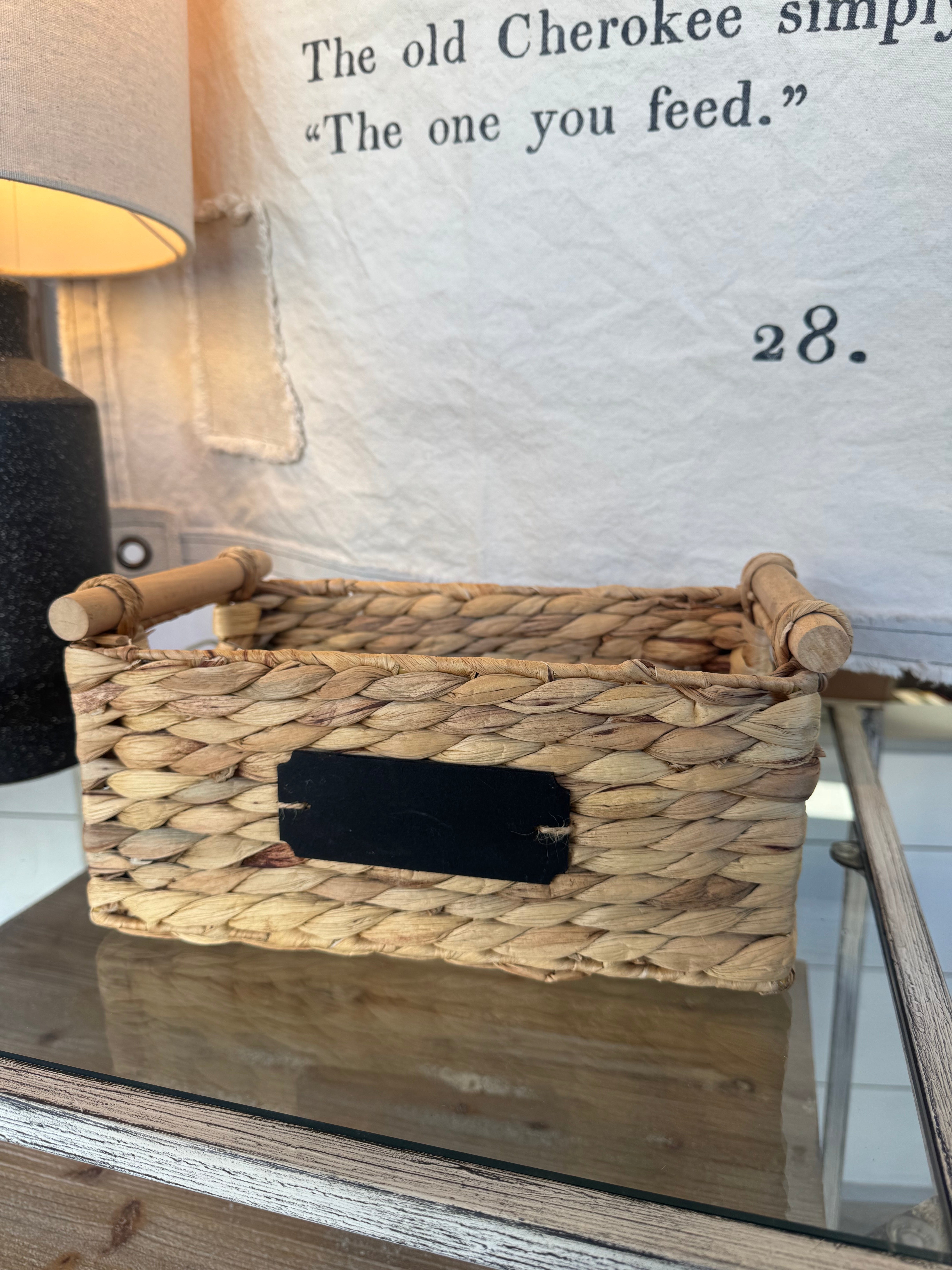 Organize in style with this charming woven basket featuring a built-in chalkboard label! Perfect for storing everything from pantry staples to craft supplies, this dual-purpose piece brings rustic warmth and practical function to any room. The natural woven texture adds cozy appeal, while the chalkboard lets you label contents with a fun, changeable touch. Whether you're tidying up a kitchen, playroom, or office, this basket makes storage feel less like a chore and more like decorating. A delightful way to keep things neat without sacrificing personality! 12in x 7.5in