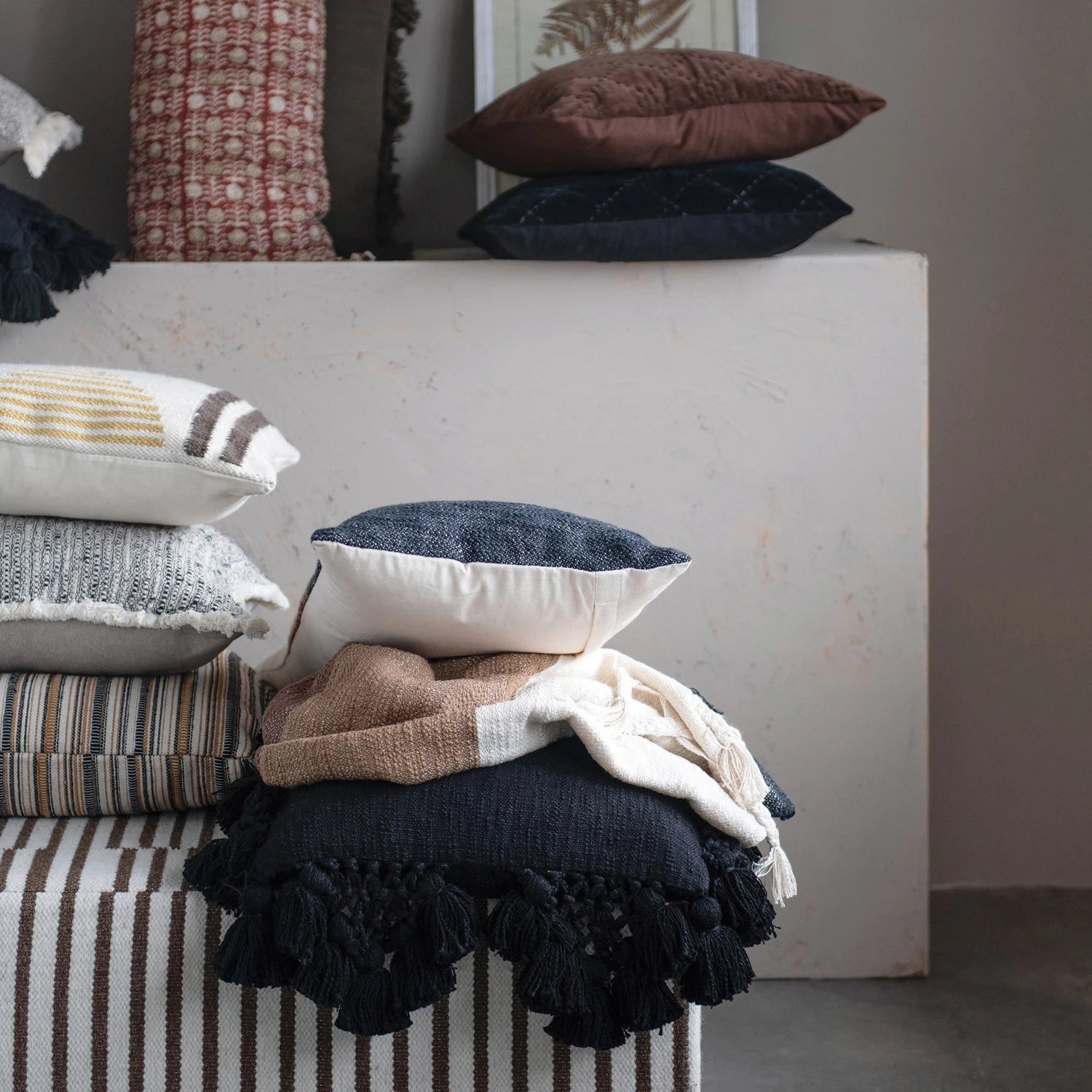 Woven Cotton Pillow w/ Chambray Back & Eyelash Fringe, Down Fill