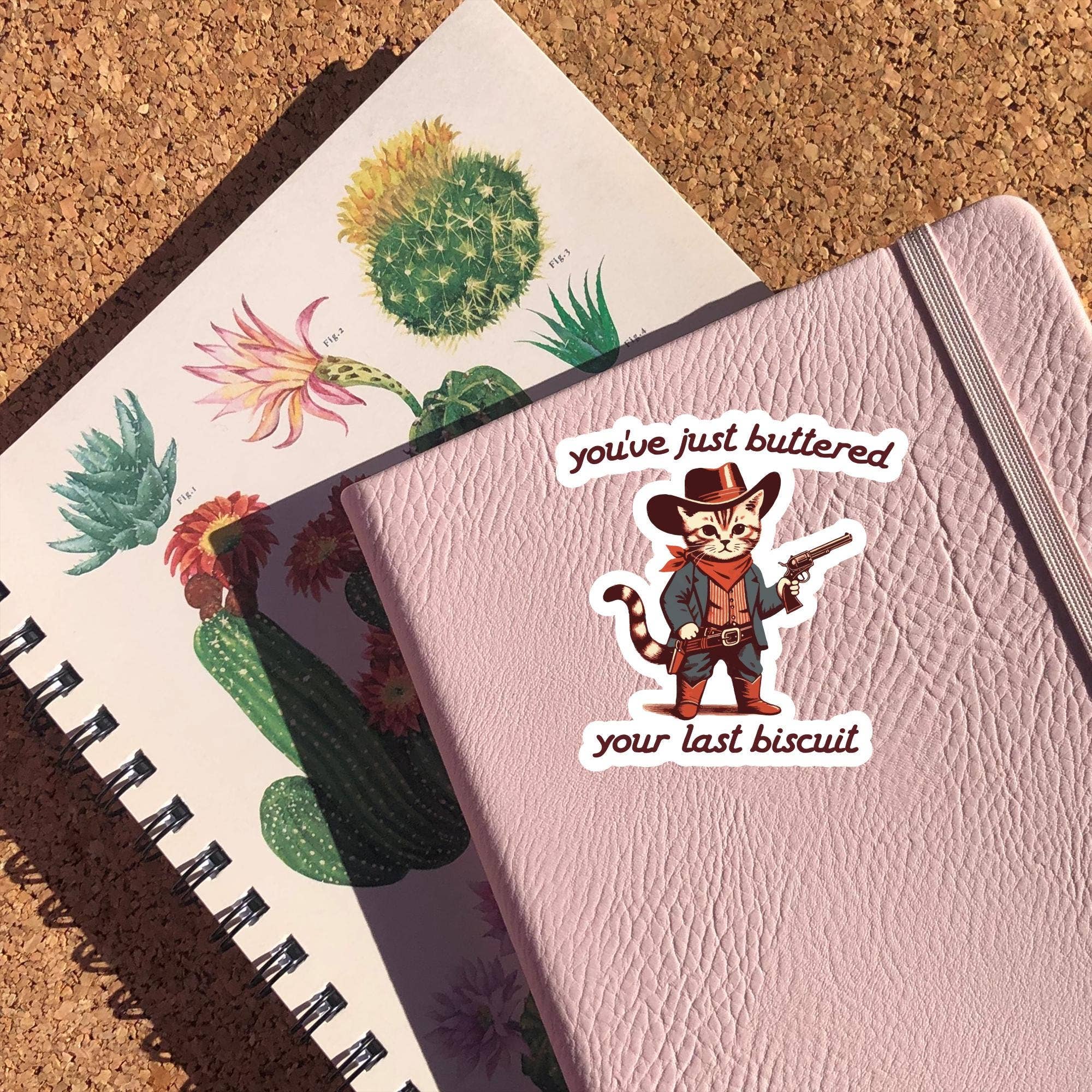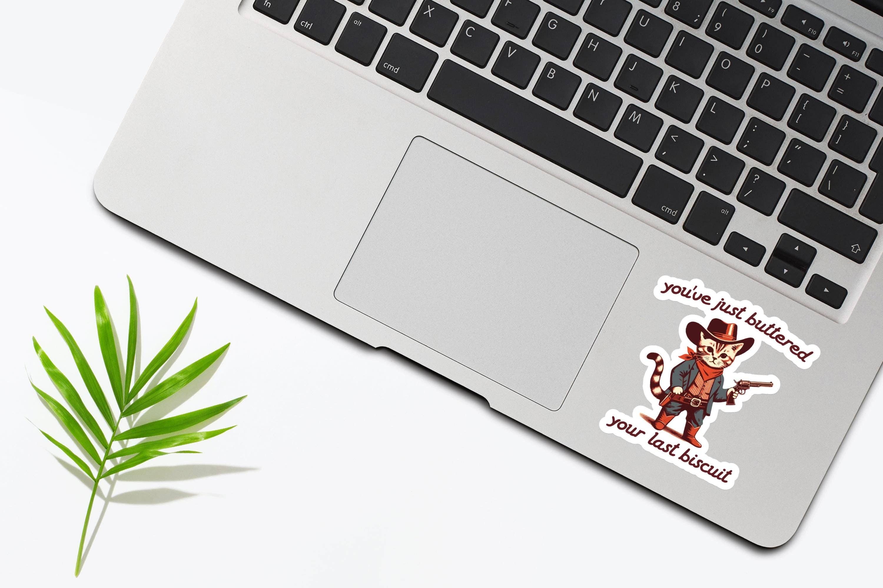 This You've Just Buttered Your Last Biscuit Sticker is perfect for laptops, notebooks, phones, tablets, mirrors, water bottles, tumblers, planners, journals, cars, and more About Our Stickers - High-Quality Glossy Vinyl - Waterproof & Weatherproof - 4-5 Year Outdoor Life - Scratch Resistant Sticker size is determined by the longest side of the design. If you have any questions about custom sizes or quantities please message us .
